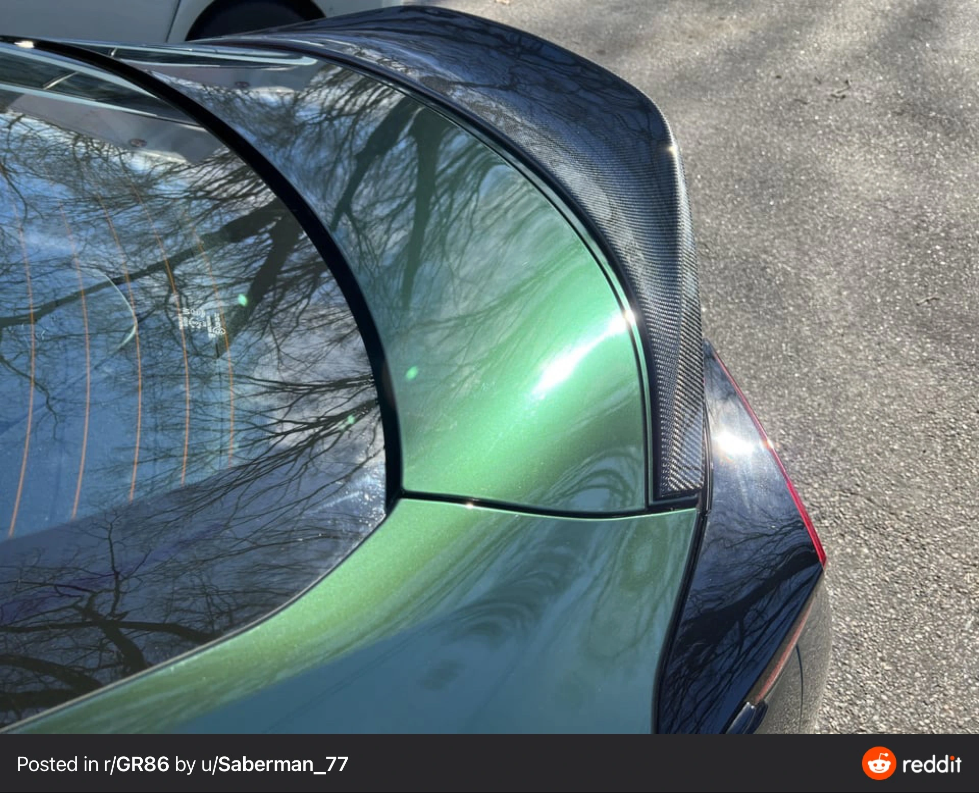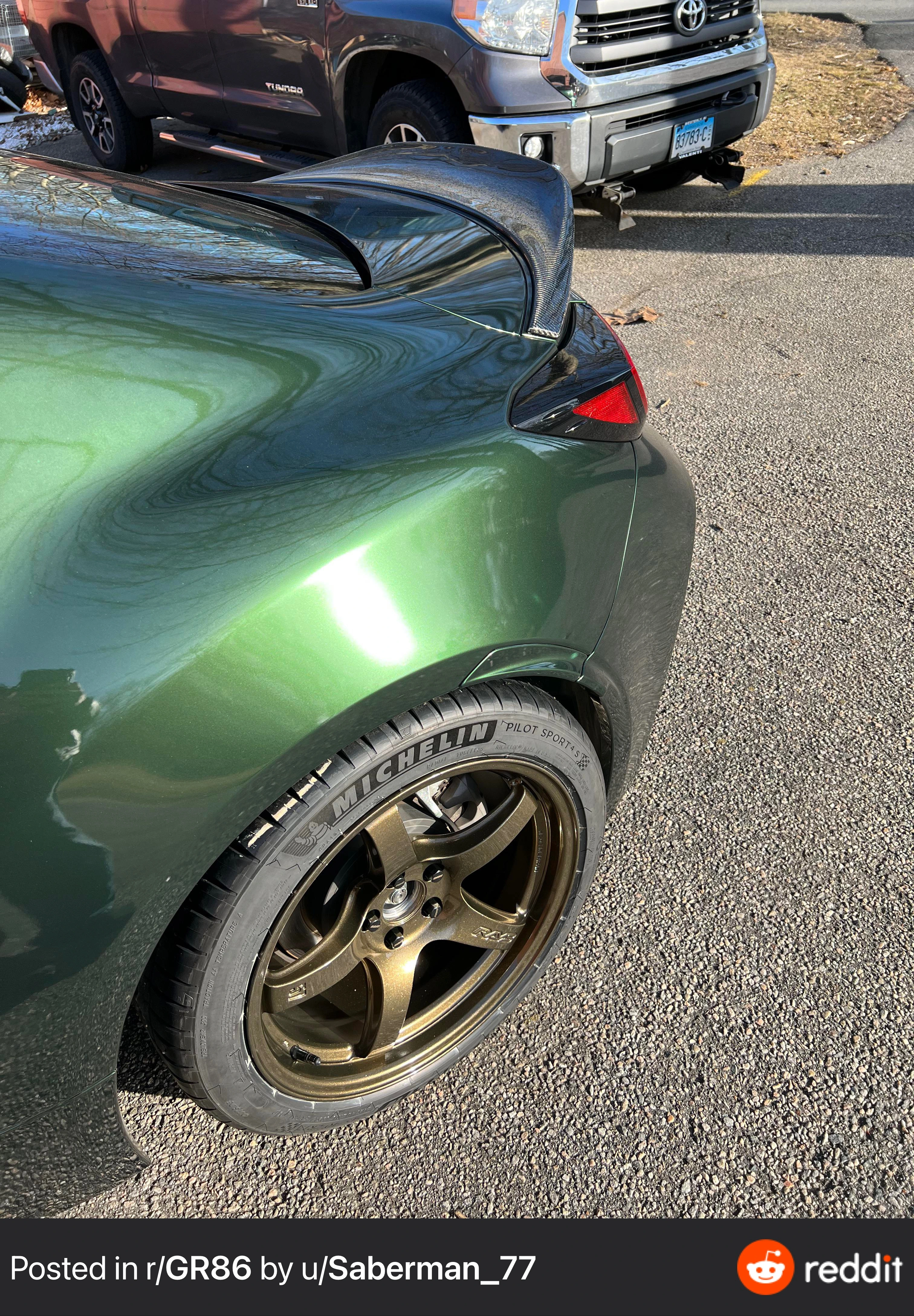 That car looks great tho - had to look it up… the wrap is Inozetek Midnight Metallic Green. And looks epic on 17”s…I really like the look of a carbon fibre Duck Tail spoiler. I’m tempted to go for one of these over the OEM version.